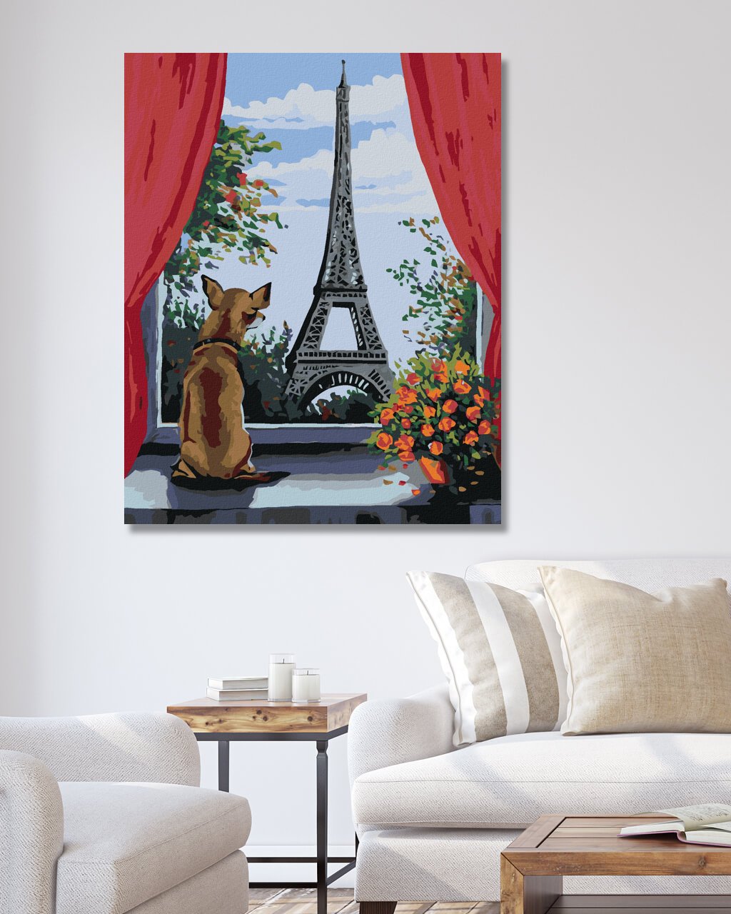 Haft diamentowy - Para z psem z widokiem na Wieżę Eiffla