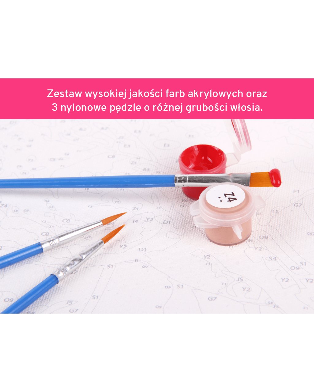 Do malowania oprócz szablonu będziesz potrzebować kilku innych rzeczy: farby, pędzle, może sztaluga, aby Ci się wygodniej malowało. To wszystko oczywiście dostarczymy w zestawach do malowania po numerach.Możesz wybierać spośród setek motywów w różnych rozmiarach. Do każdego wybranego motywu dostarczymy dokładnie takie farby, jakich potrzebujesz.