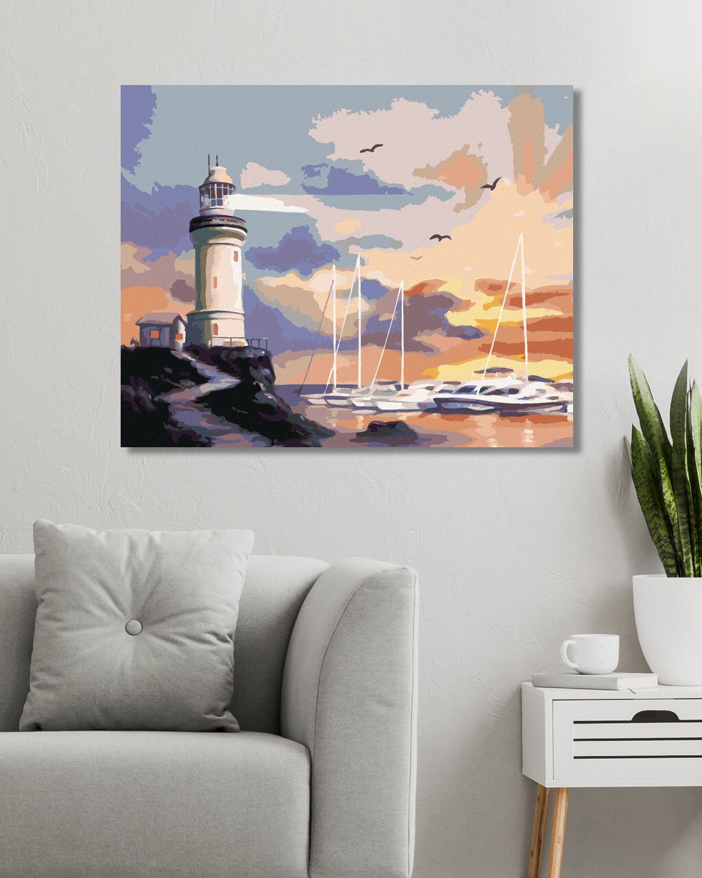 Malowanie po numerach - ŻAGLOWIEC, LATARNIA MORSKA I ZACHÓD SŁOŃCA (D. RUSTY RUST)